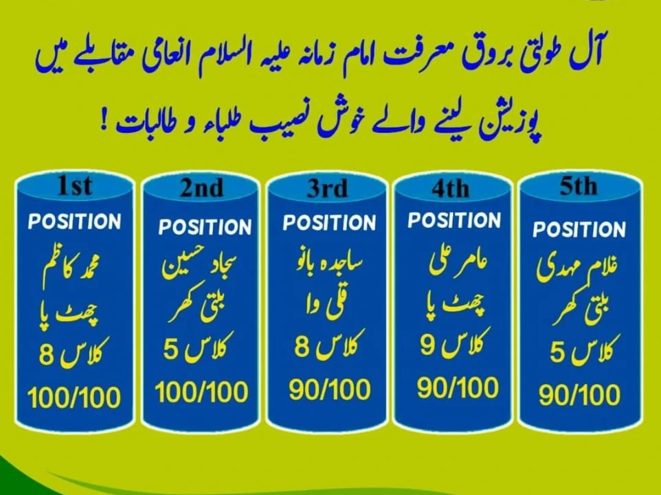 Asgaria Welfare Society Balti Khar and BSO Balti Khar Students organized an examination competition under the title of Knowledge of Imam al-Zamana (A.S). A total of 184 students from the entire region participated in the competition. Various prizes were awarded to those who showed outstanding performance in the competition. Among those who got prominent positions, Muhammad Kazim got the first position in the eighth grade, Sajjad Hussain got the second position in the fifth grade, Sajda Bano got the third position, Amir Ali got the fourth position in the ninth grade, and Ghulam Mehdi got the fifth position in the fifth grade.